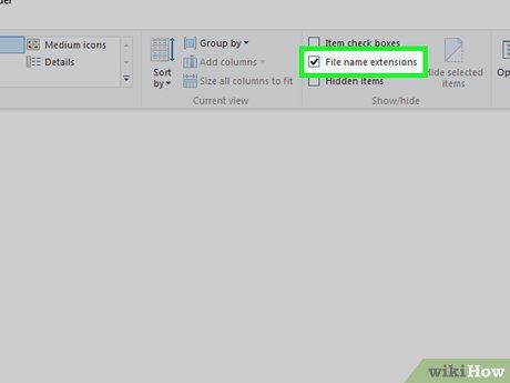 Bạn cần chắc chắn rằng phần mở rộng tập tin đang hiển thị. Theo mặc định, phần mở rộng tập tin thường bị ẩn. Sau đây là cách hiển thị phần mở rộng tập tin: Mở thanh tìm kiếm Windows và nhập file options. Nhấp vào File Explorer Options trong danh sách kết quả. Nhấp vào thẻ View (Chế độ xem) nằm đầu cửa sổ. Xóa dấu tích khỏi ô 'Hide extensions for known file types' (Ẩn phần mở rộng với loại tập tin đã biết) bên dưới tiêu đề 'Advanced Settings' (Cài đặt nâng cao). Nhấp vào OK.