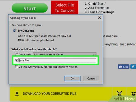 Nhấp vào Sử dụng .docx (Sử dụng .docx). Tập tin sẽ được lưu với đuôi .docx. Nếu bạn thử mở tập tin trong Word, thông báo lỗi sẽ hiện ra cho biết rằng tập tin bị hỏng.