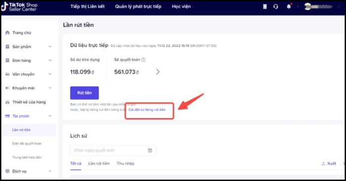 Cài đặt tính năng rút tiền tự động trên TikTok Shop