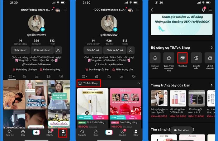 Bước 2: Khi giao diện TikTok Shop hiện ra, người dùng hãy chọn hồ sơ người bán hoặc tài khoản của bạn và nhấn vào tùy chọn Thu nhập.