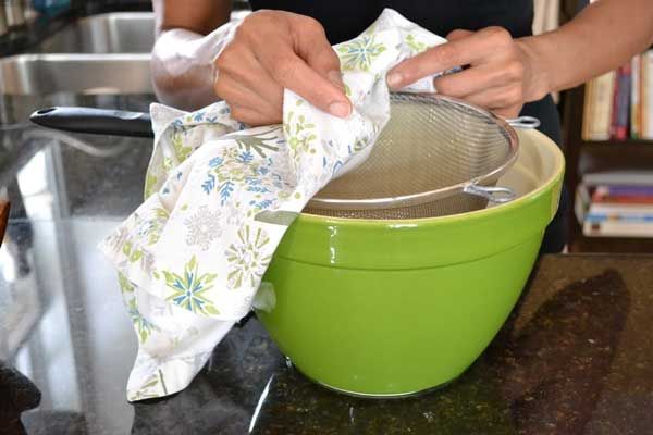 Bước 1: Đặt ray lọc lên tô và đặt một tấm khăn mỏng lên ray.