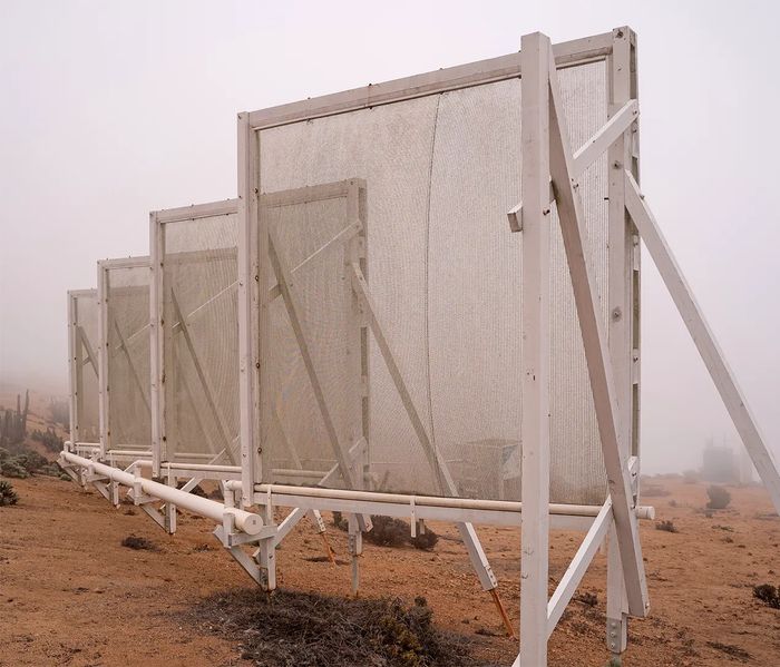 Một loạt các tấm lưới “bắt” màn sương mù sa mạc dày đặc được mệnh danh là camanchaca. Dòng chảy từ các tấm lưới cung cấp nước cho bồn rửa công cộng. Bên dưới tấm lưới là các ống dẫn nước. Ảnh: Zack Savitsky.