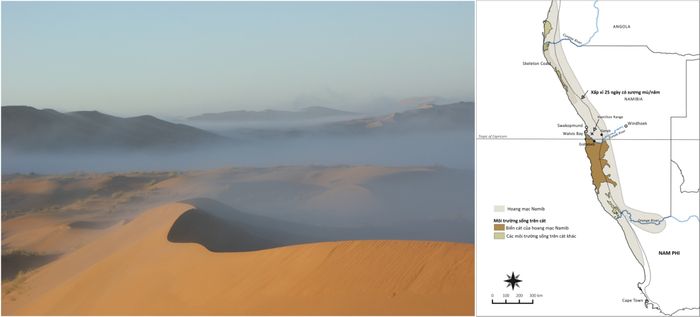 Ảnh bên trái: Màn sương mù đặc trưng vào buổi sáng của Sa mạc Namib, phủ lên cồn cát của biển cát miền trung Namib, được UNESCO công nhận là Di sản Thế giới. Ảnh bên phải: Bản đồ miêu tả phạm vi địa lý của Sa mạc Namib. Ở Namibia, lằn ranh sương mù chạy dọc theo biên giới phía đông của khu vực, với khoảng 25 ngày sương mù mỗi năm. Sương mù ít xuất hiện hơn ở phía đông của ranh giới này. Hình dạng của đường sương mù này ở Nam Phi và Angola chỉ là một ước lượng. “Môi trường sống trên cát” đề cập đến những vùng có lớp cát dày đủ để tạo ra cồn cát thường xuyên. Dải đất này gần như là một bản sao của địa hình và khí hậu camanchaca ở Chile. Nguồn: ESA Journals.