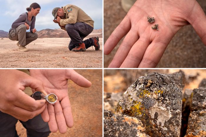 Nhà nghiên cứu Liesbeth van den Brink và nhân viên kiểm lâm công viên José Luis Gutiérrez Alvarado đang khám phá các vi sinh vật “vỏ đá cứng” sống trên đá cuội trên nền sa mạc. Kính lúp của Gutiérrez Alvarado phóng to mọi chi tiết.Bí mật của da hành tinh