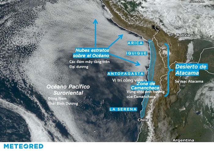Các vùng màu trắng trên đại dương tương ứng với loại mây tầng. Những đám mây này xuất hiện gần như suốt năm và tạo ra hiện tượng thời tiết camanchaca. Khu vực chịu ảnh hưởng sương mù nặng chỉ nằm dọc theo bờ biển phía bắc Chile và một phần nhỏ của Peru, với công viên Pan de Azúcar nằm ngay trung điểm của dải đất này. Lý do mà chúng chỉ phân bố ven biển là vì dãy Andes sâu trong đất liền đã ngăn chặn dòng sương mù tiến xa hơn, vì vậy hai bên sườn núi thuộc Chile, Bolivia và Argentina thực sự là các miền khí hậu rất khác nhau. Ảnh: Meteored.