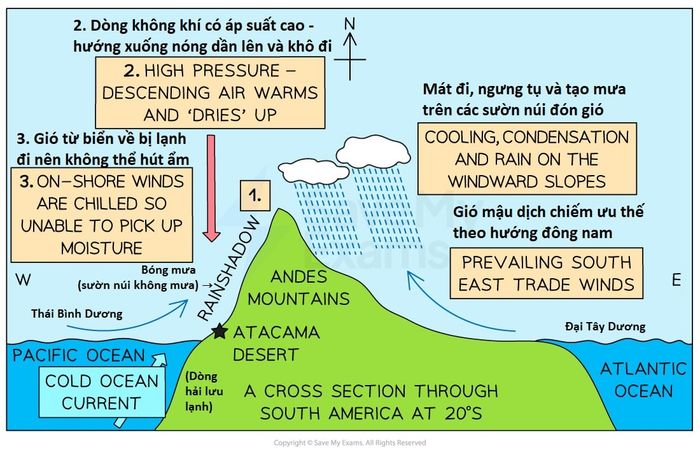 Cơ chế giải thích sự khô hạn của Atacama: Đầu tiên, sa mạc nằm ở phía bên trái của dãy Andes và gió thịnh hành mang theo không khí ẩm buộc phải bay lên cao. Hơi ẩm ngưng tụ và rơi xuống phía của dãy Andes đối diện với Atacama. Điều này thường được gọi là bóng mưa. Thứ hai là áp suất không khí cao. Về cơ bản, không khí đi xuống ấm lên, nghĩa là bất kỳ hơi ẩm nào bên trong đều chuyển thành hơi nước (khí, không phải chất lỏng) trái ngược với mưa. Cuối cùng là dòng hải lưu Humboldt lạnh giá từ nam Thái Bình Dương. Bất kỳ cơn gió nào trên đất liền đều bị làm lạnh nên chúng không thể hút hơi ẩm từ đại dương. Khi cộng dồn lại, hiệu ứng của ba điểm nói trên tạo ra nơi khô hạn nhất trên trái đất. Ảnh: SME.