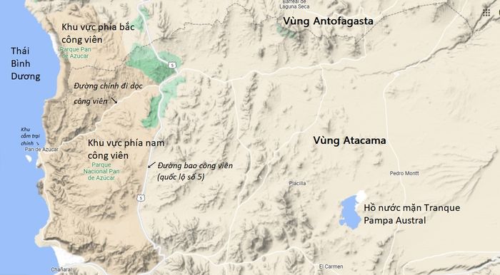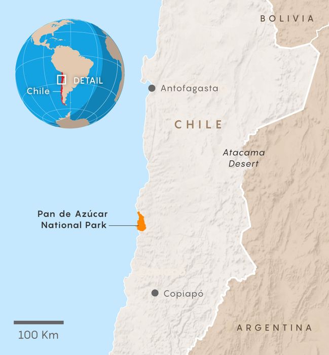 Pan de Azúcar hoang vu, nhưng không hề tịch mịch. Nằm gần Thái Bình Dương, công viên có khí hậu ôn hòa hơn nhiều so với vùng cao nguyên khô cằn trên Atacama. Mặc dù nhận được lượng mưa hàng năm chỉ 12 mm, nhưng mức độ chiếu sáng mặt trời thường xuyên cao đến đáng kinh ngạc. Trên đường đến xe bán đồ ăn duy nhất của công viên, nơi Gutiérrez Alvarado, van den Brink và tôi (tác giả Savitsky) có thể dừng lại để thưởng thức một món hải sản địa phương có tên empanada, chúng tôi đi một vòng quanh. Gutiérrez Alvarado dừng lại để kiểm tra thiết bị theo dõi thời tiết của mình, được bọc bên ngoài bằng dây thép gai và cột chặt vào đất sa mạc bằng đá. Bên cạnh đó, anh chỉ ra một khu vực trống trên mặt đất gần bằng con bò, nơi mà một con guanaco, họ hàng hoang dã của lạc đà không bướu, gần đây đã tắm mình trong cát. Gutiérrez Alvarado và các nhân viên kiểm lâm khác gần đây đã đếm được 83 con guanacos đang sinh sống trong công viên.