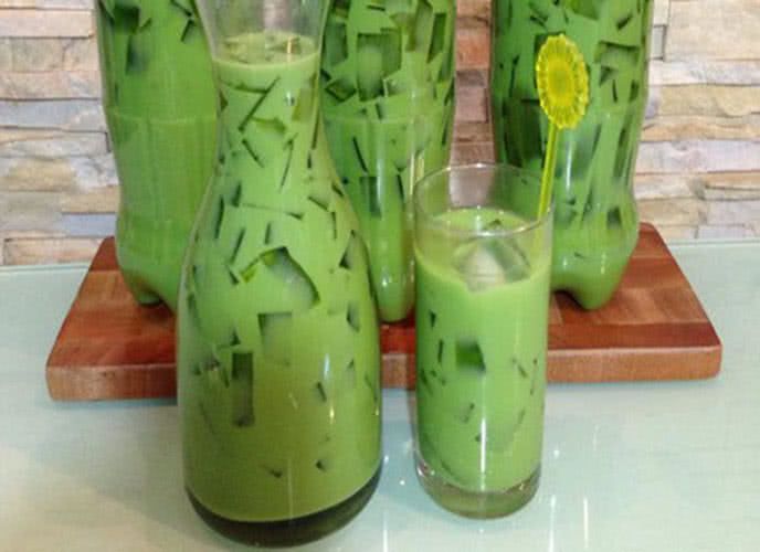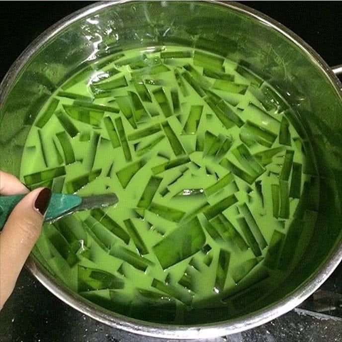 Bước 4: Đổ hỗn hợp vào hộp nhựa, để nguội và cất vào tủ lạnh khoảng 2 tiếng. Sau thời gian này, thạch trà xanh đã sẵn sàng. Cắt thành sợi vừa khi ăn.
