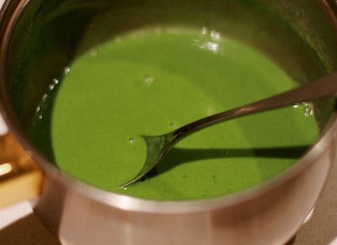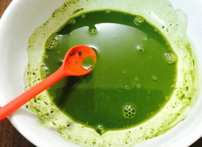 Bước 1:Cho bột trà xanh vào bát, đun sôi 200 ml nước và đổ vào. Khuấy đều theo một hướng nhất định, đợi vài phút để trà ngấm vào nước.