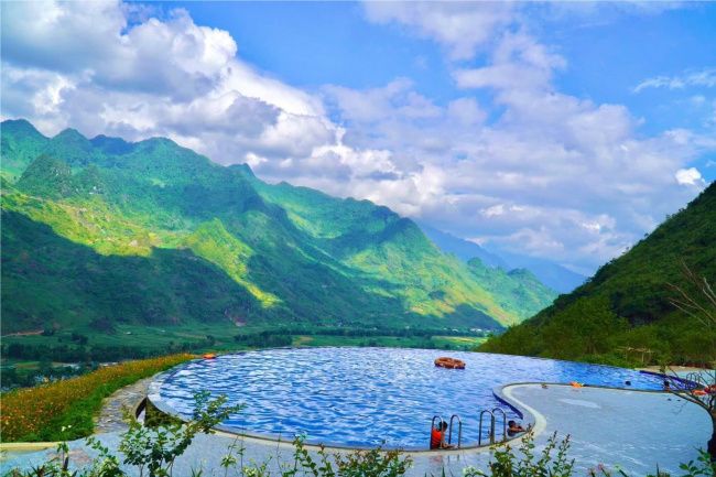Bên cạnh đó, khu nghỉ dưỡng còn có một hồ bơi vô cực với nước xanh ngọc lấp lánh dưới ánh nắng. Du khách có thể lựa chọn liệu trình tắm lá thảo mộc để thư giãn, khôi phục năng lượng và xua đi mệt mỏi, lo âu hàng ngày.