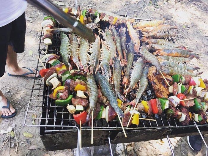 Do vị trí hẻo lánh của Làng Vân, dịch vụ ẩm thực ở đây chưa phát triển mạnh. Để có bữa ăn ngon ngày giữa thiên nhiên biển cả, bạn nên chuẩn bị sẵn các nguyên liệu tại nhà. Có thể mua sẵn các đặc sản của Đà Nẵng như tôm, cá, thịt để tự nướng BBQ ngoài trời, tạo nên bữa tiệc thú vị.