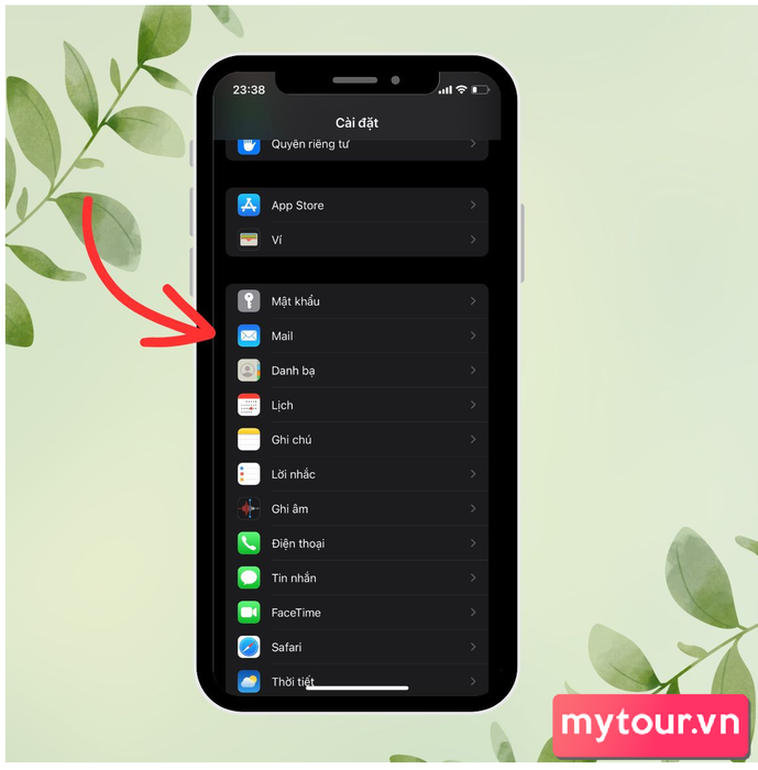 Bước 1:Mở ứng dụng Cài đặtChọn mục Mail trong danh sách ứng dụng.