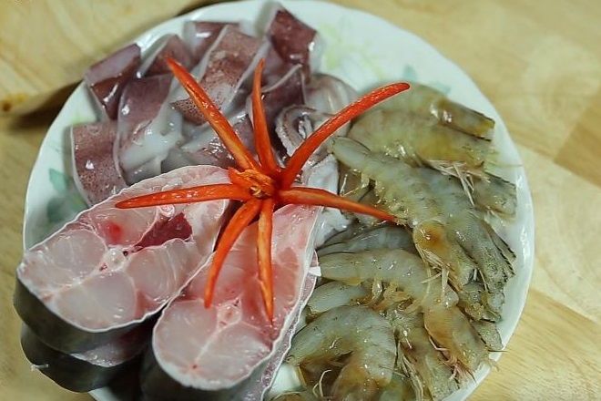 Sôi lên một nồi nước khoảng 1 lít, lần lượt thả cá, tôm, mực vào luộc chín. Vớt hải sản ra và đặt vào thau nước lạnh, giữ nguyên độ giòn và màu tươi của chúng.
