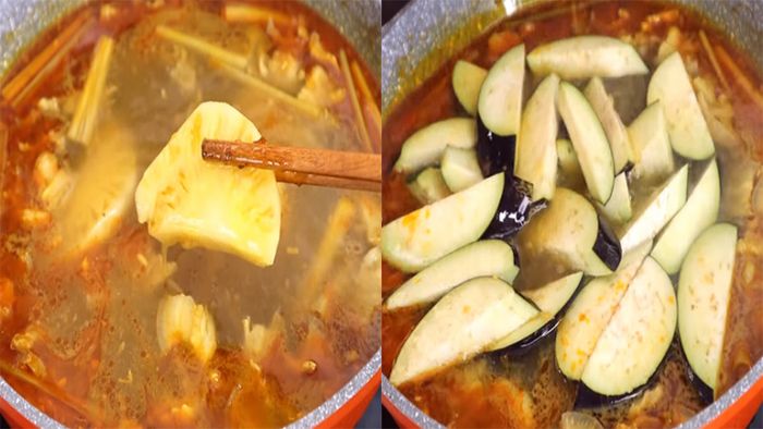 Nêm gia vị: hạt nêm, đường, nước mắm, và thêm cà tím. Chờ cho lẩu sôi lại, khi cà tím chín thì tắt bếp.