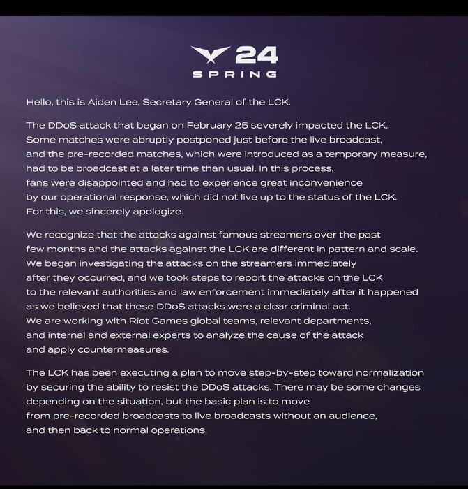 'Xin chào, tôi là Aiden Lee, Tổng Thư ký của LCK. Cuộc tấn công DDoS đã gây ảnh hưởng lớn đến chúng tôi. Chúng tôi xin lỗi vì những phiền toái này.'