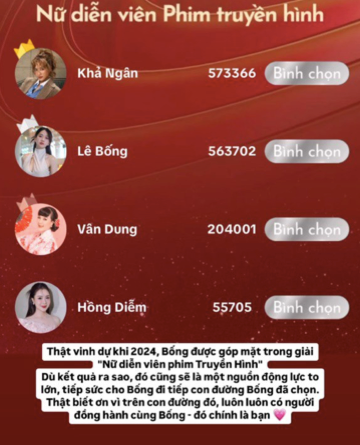 Sau những thành công ban đầu, sự nỗ lực của Lê Bống tiếp tục được ghi nhận với đề cử giải thưởng 'Cánh Diều Vàng' năm nay. Cô cho rằng cơ hội này là nhờ tình cảm và sự ủng hộ của khán giả.