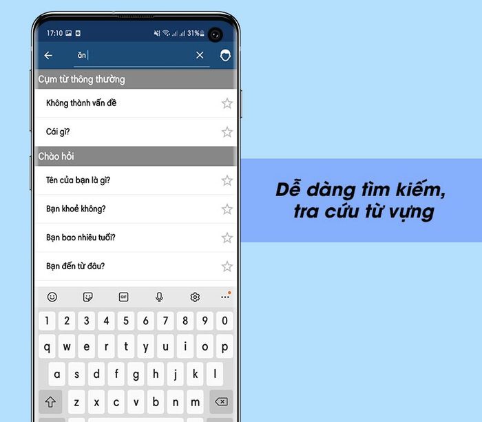 Learn Japanese Phrases giúp bạn dễ dàng tìm kiếm và tra cứu từ vựng nhanh chóng trong ứng dụng bằng thanh tìm kiếm. Bạn có thể nhập từ cần tìm bằng tiếng Việt hoặc tiếng Nhật một cách thuận tiện với chức năng gợi ý từ.