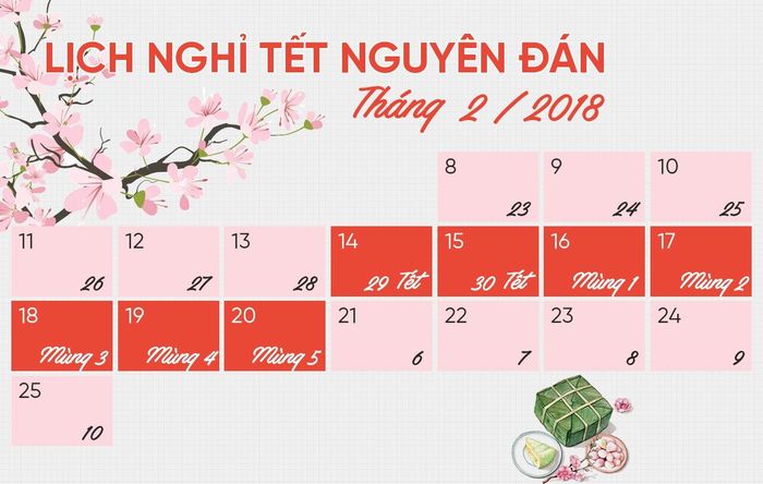 Lịch nghỉ Tết Âm lịch 5 ngày và 2 ngày nghỉ bù, tổng cộng 7 ngày từ 14/2/2018 đến 20/02/2018 (từ 29 tháng Chạp đến hết mùng 5 Tết)