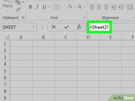 - Hoặc bạn có thể tự nhập vào thanh công thức. Công thức sẽ tương tự như sau =<TênTrang>!, trong đó '<TênTrang>' là tên trang nguồn của bạn.