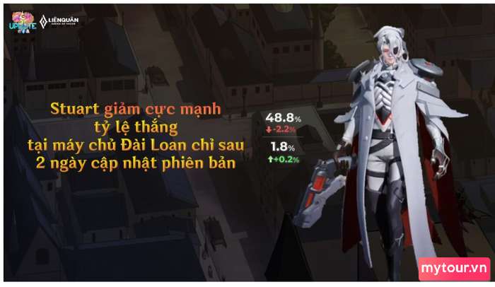 Đúng như dự đoán, sau khi cập nhật tại máy chủ chính Đài Loan, tỷ lệ chiến thắng của Stuart (so với Joker trước khi update) giảm đáng kể. Trong 7 ngày trước khi cập nhật mới vào ngày 08/11, tỷ lệ thắng của Joker là 51.0%, nhưng sau cập nhật, chỉ còn 48.8%. Tổng tỷ lệ thắng trung bình của Stuart sau 2 ngày chỉ khoảng 43% (giảm 8%). Theo nhiều tin đồn, tỷ lệ này có thể giảm thêm trong thời gian sắp tới. Vậy, tại sao Stuart 'mất giá' như vậy?