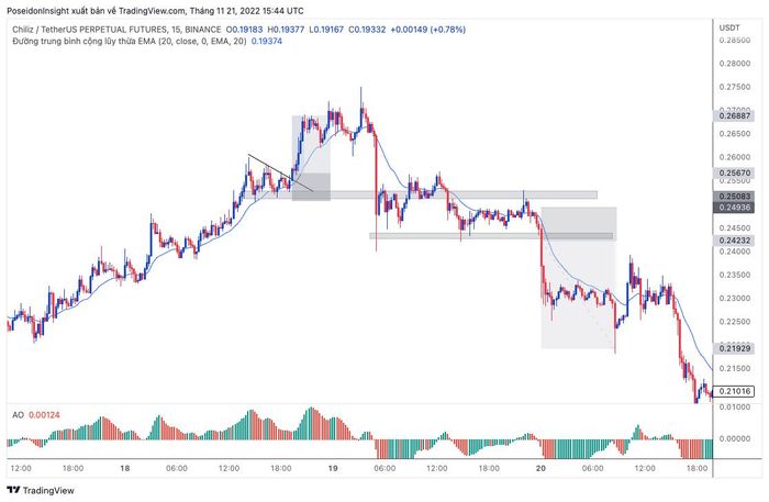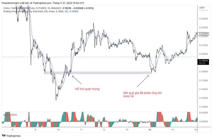 Mình đã nhập thị trường CHZ hai lần bằng cách kết hợp hỗ trợ cứng và hỗ trợ động là EMA (20) – đường màu xanh biển.