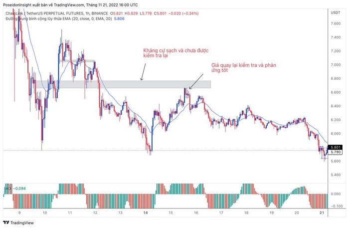 LINK có một kháng cự đã được kiểm tra 3 lần ở vùng giá 5.792. Nếu bạn quyết định 'short ở kháng cự', bạn có thể dễ dàng short khi có cây nến đỏ xuất hiện lần thứ 4 và đặt stop-loss.