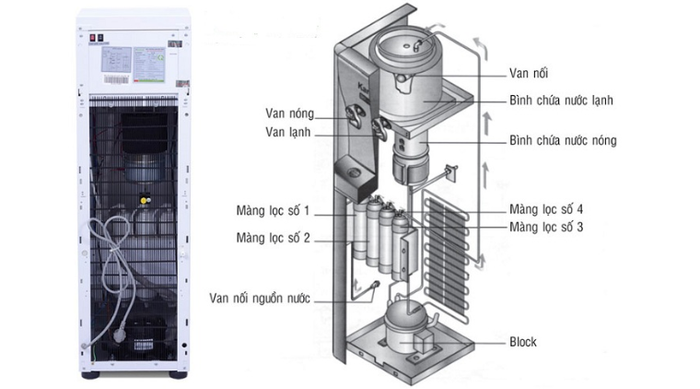Hệ thống cây nước nóng lạnh sử dụng công nghệ block được chia thành 2 bộ phận chính: tạo nước nóng và tạo nước lạnh. Cả hai bộ phận này đều có các linh kiện quan trọng như sau: