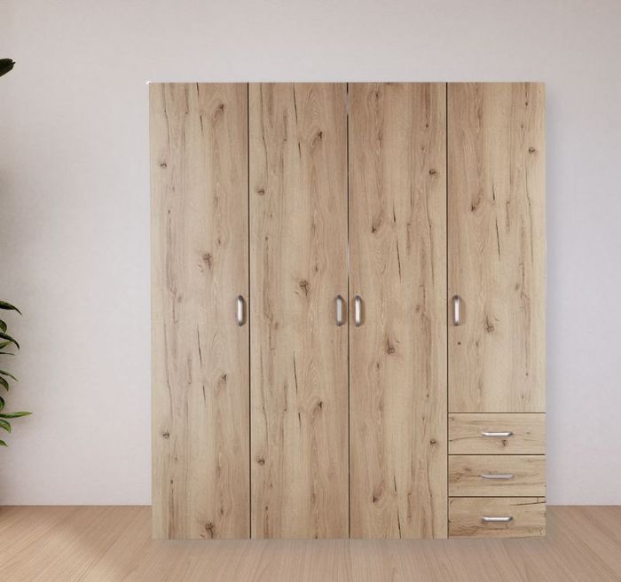 Sản phẩm có kích thước 181.6 x 59.5 x 216 cm, được làm từ chất liệu gỗ MDF màu sồi, bền bỉ và chống ẩm mốc, mối mọt hiệu quả. Với 4 cửa rộng rãi, tủ đảm bảo sự an toàn và phục vụ nhu cầu không gian của mọi gia đình.