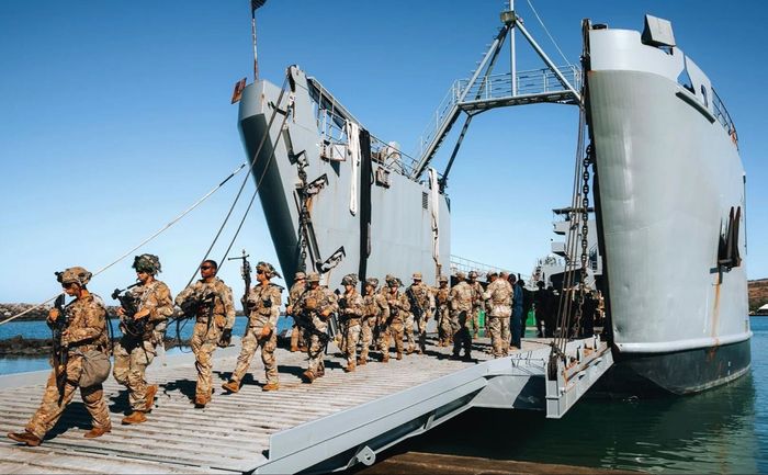 Xà lan kéo dạng mô-đun (MWT) - một dạng phương tiện mặt nước thô sơ nhất trong đội tàu của Lục quân, bên trái, và tàu kéo lớn LT-800 của Lục quân Mỹ. Ảnh: Flickr.Cách hoạt động của Hạm độiChúng ta hãy xem xét tình huống Lục quân Hoa Kỳ sử dụng tàu của mình để hỗ trợ lực lượng mặt đất. Một kịch bản được tưởng tượng là khi họ tiến vào bán đảo Triều Tiên và đối mặt với sự kháng cự mạnh mẽ. Để vượt qua tình huống này, họ quyết định tiến hành một cuộc không kích bằng bộ binh hạng nhẹ trên Hoàng Hải, sử dụng trực thăng để nhanh chóng vận chuyển các đơn vị bộ binh hạng nhẹ tới bãi đáp trên bờ biển. Họ cần chọn một địa điểm ven biển để có lợi thế chiến thuật trước đối phương.Các tàu như LCU-2000 và MSV-L đóng vai trò quan trọng trong tình huống này. Chúng bắt đầu từ việc chất hàng lên tàu tại một cảng ở Hàn Quốc, sau đó di chuyển để hỗ trợ lực lượng đổ bộ đường không, mang theo vật tư và thiết bị nặng như xe chiến đấu M10 Booker. Điều này giúp Lục quân duy trì thế tiến công và đảm bảo lực lượng của mình được hỗ trợ tốt.