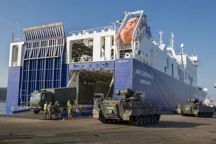 Xe chiến đấu bọc thép Marder được chuyển xuống tàu Ro-Ros tên Ark Germania của Đan Mạch tại cảng Fredrikstad ở Na Uy, kế bên là các xe tăng chiến đấu chủ lực Leopard 2, trong cuộc tập trận Trident Juncture của NATO, năm 2018. Ảnh: Dvidshub.