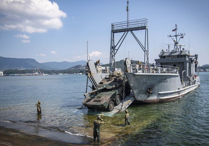 Một Xe chiến đấu cơ động (MCV) của Nhật Bản được thả xuống từ tàu LCU của Quân đội Hoa Kỳ tại Hạm đội Sasebo (CFAS), vào ngày 27 tháng 9 năm 2021. LCU, dù nhỏ hơn LSV, có boong tàu gần mặt nước. Ảnh: Popular Mechanics.