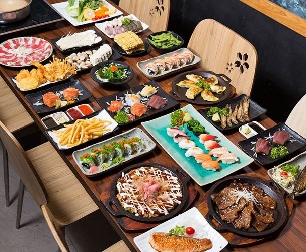 Thực đơn tại đây thực sự đa dạng và phong phú. Bạn sẽ có cơ hội thưởng thức đủ loại sushi trong món khai vị. Món chính bao gồm thịt bò Úc, bò Mỹ, thịt gà và đặc biệt là hải sản như tôm, mực, bạch tuộc,… Ngoài ra, còn có rất nhiều loại rau tươi, đậu phụ, mỳ, rong biển,…