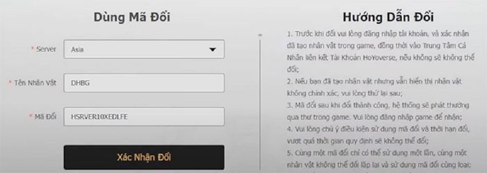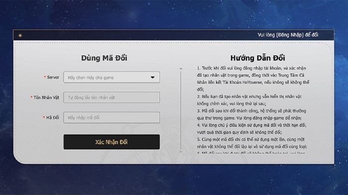 Đăng nhập vào tài khoản để bắt đầu trải nghiệm game (Nguồn: Internet)- Bước 3: Khi đã vào game, chọn server và nhân vật, sau đó dán code Honkai Star Rail còn hạn sử dụng vào ô 'Mã Đổi'. Cuối cùng, nhấn 'Xác Nhận Đổi' để nhận quà ngay lập tức.