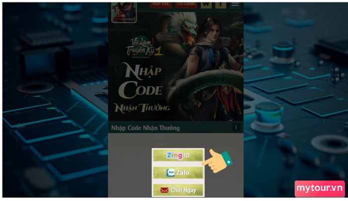 Bước 1:Tại trang chủ này, người chơi sẽ chọn hình thức đăng nhập, có thể là Zing ID hoặc Zalo, tùy thuộc vào tài khoản đã liên kết trước đó với trò chơi.