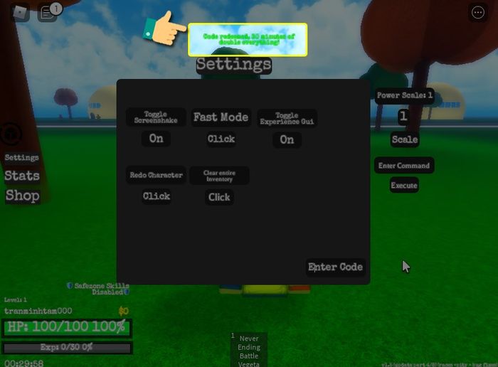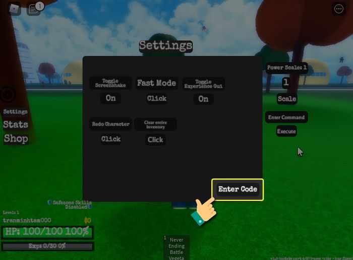 Mở game DBZ Adventures Unleashed > Chọn cài đặt và nhập mã code vào ô nhập code > Bấm enter để nhận ngay quà!