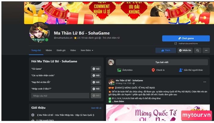 Hiện nay, tựa game Ma Thần Lữ Bố đã có Fanpage cộng đồng chính thức. Hãy theo dõi trang thông tin để cập nhật thông tin về sự kiện phát giftcode từ nhà phát hành hoặc chia sẻ giữa cộng đồng game thủ.