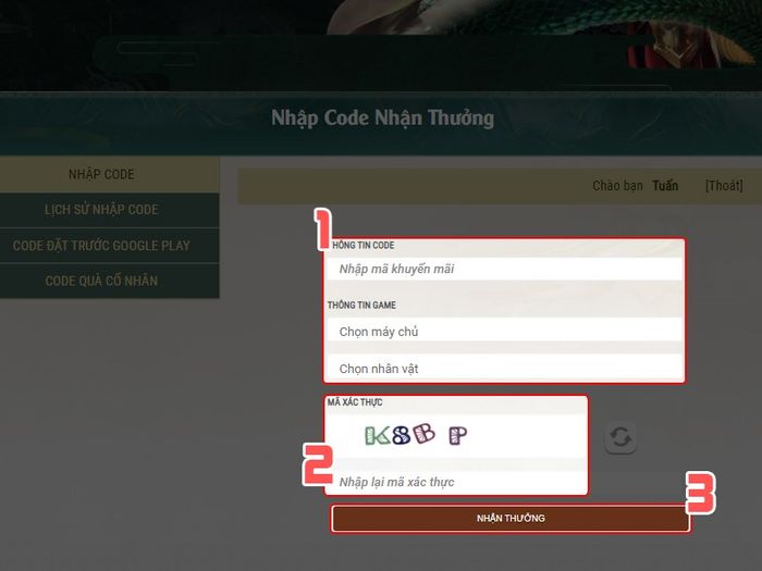 Bước 3: Nhập mã khuyến mãi, thông tin về máy chủ trong game và chọn nhân vật để nhận code. Sau đó, điền mã xác thực ở phía dưới. Kiểm tra thông tin, nhấn Nhận Thưởng khi chắc chắn đã đúng.