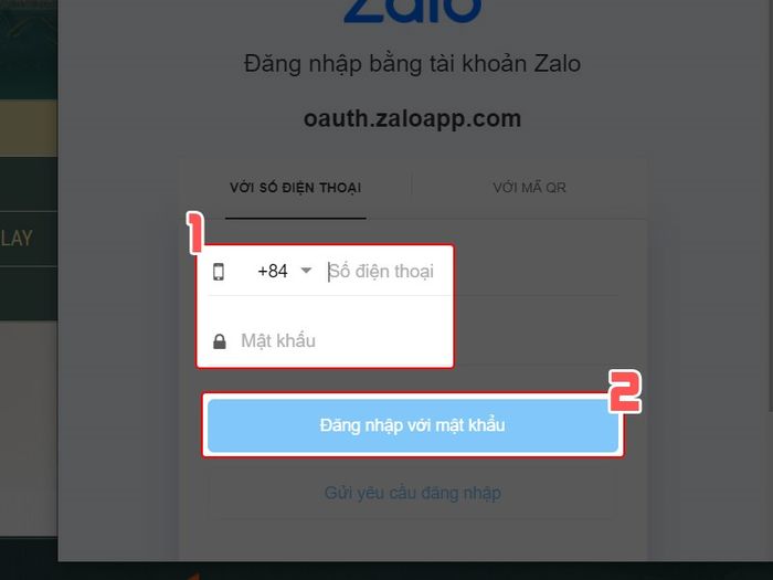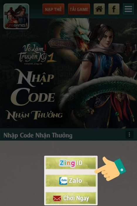 Bước 1: Truy cập vào trang web nhập mã code của trò chơi Võ Lâm Truyền Kỳ 1 Mobile. Sau đó, lựa chọn hình thức đăng nhập (Zing ID, Zalo).