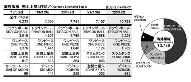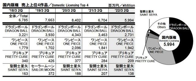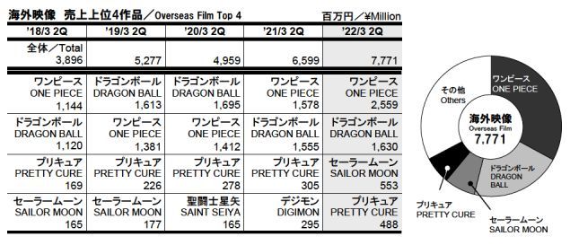 Tổng doanh thu của Toei Animation trong quý 2/2022 là 24.504 triệu Yên (tăng mạnh nhất trong 5 năm qua). Doanh số được phân loại như sau: