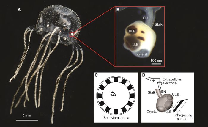 Các cơ quan rhopalium (B) trên cơ thể sứa (A). (C) biểu trưng cho môi trường thí nghiệm. (D) là cấu trúc vật lý-thần kinh khi rhopalium nhận diện tín hiệu cảnh báo va chạm