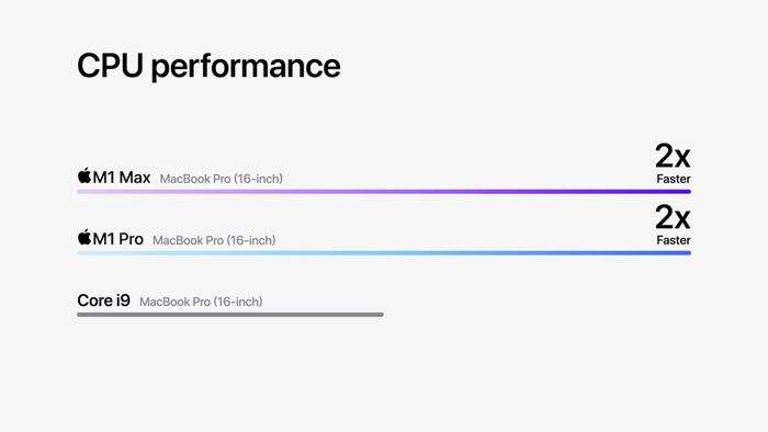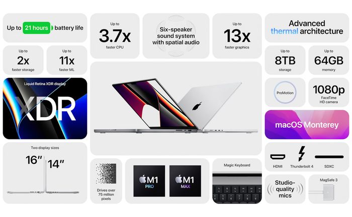 Về phần cứng, chúng ta có lựa chọn giữa chip M1 Max và M1 Pro, với hiệu suất CPU gấp đôi so với Core i9 trên các phiên bản Macbook 16 inch trước đó. Hiệu suất xử lý đồ họa của M1 Max và M1 Pro cũng tăng lần lượt lên 4 và 2.5 lần so với Radeon Pro 5600M trên Macbook Pro 16 inch cũ. SSD tiếp tục sử dụng các bộ nhớ có tốc độ đọc lên đến 7.4GB/s, với bộ nhớ RAM bắt đầu từ 16GB RAM cho bản 14 inch (lên đến 32GB cho M1 Pro hoặc M1 Max, và tối đa 64GB cho M1 Max).
