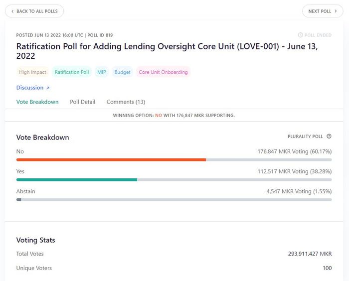 Để hiểu rõ hơn về mức độ tranh cãi trong LOVE, vào thời điểm kết thúc cuộc bỏ phiếu vào ngày 29/06/2022, đã có hơn 293 nghìn MKR tham gia, trị giá hơn 260 triệu USD. Đây là cuộc bỏ phiếu quản trị thu hút lượng tài sản lớn nhất trong lịch sử ngành crypto.