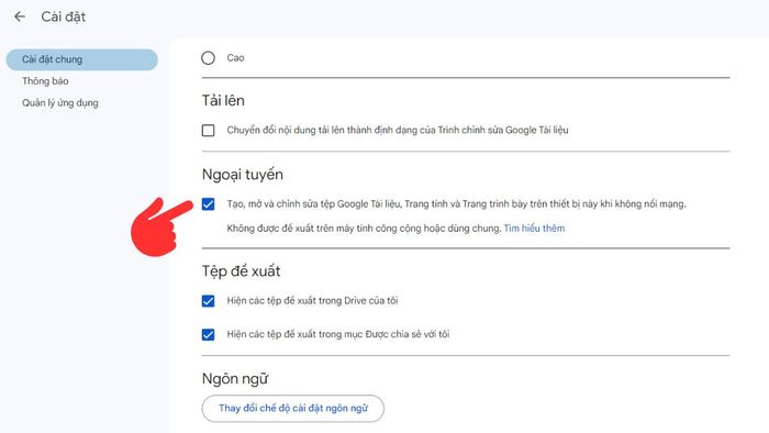 Step 2: Select 'General settings' > scroll down and locate the 'Offline' feature > check the box 'Create, open, and edit files... when you're not connected to the Internet.'