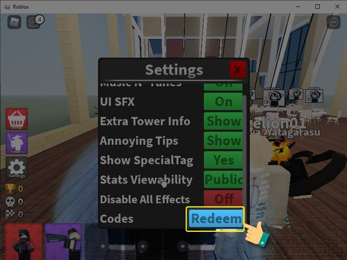 Để nhập mã trong Roblox, hãy mở game Arena: Tower Defense > Bạn nhấp vào biểu tượng Cài đặt > Tiếp theo, hãy bấm Redeem > Điền mã code và nhấn enter để hoàn thành!