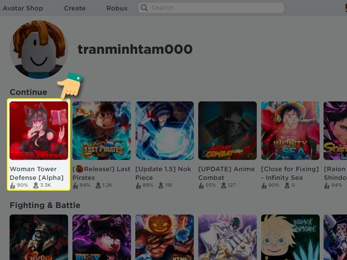 Bước 1: Trong giao diện của game Roblox, chọn vào tựa game Arena: Tower Defense đầu tiên!