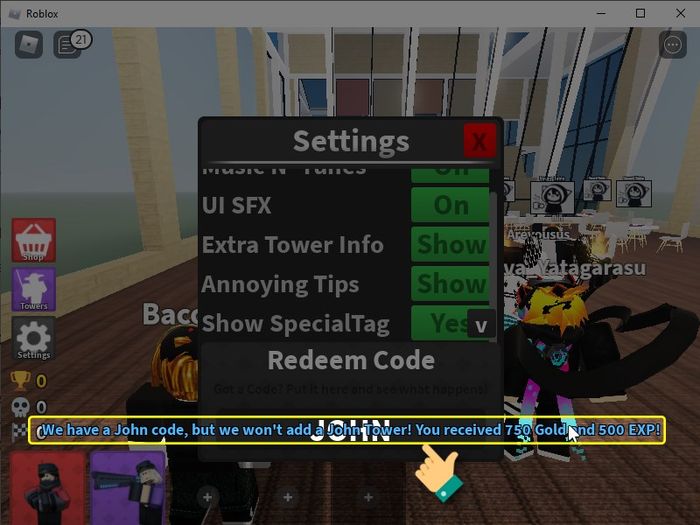 Với bước này, bạn đã thành công trong việc nhập mã code cho trò chơi Arena: Tower Defense.