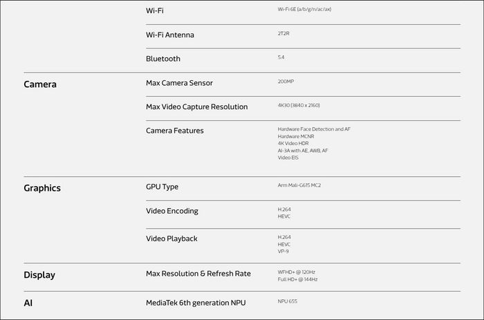 Cả hai vi xử lý này còn hỗ trợ nhiều chuẩn kết nối khác nhau (Ảnh: MediaTek).Về màn hình và các tính năng AI, Dimensity 7400 và 7400X được trang bị GPU ARM Mali-G615 MC2, hỗ trợ mã hóa video H.264/HEVC và phát lại video chuẩn H.264/HEVC/VP-9. Màn hình của hai vi xử lý này hỗ trợ độ phân giải WFHD+ với tần số quét 120 Hz và Full HD+ với tần số quét 144 Hz.