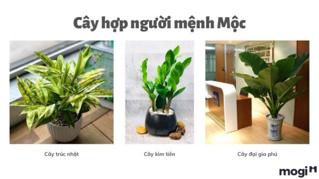 Các sự lựa chọn phong phú dành cho người mang mệnh Mộc có thể tham khảo: Kim huyền, Vượng phát gia, Trúc trùng tiên, Trúc nhật, Bàng hawai, Dương kim, Trầu bà bám cột, Vàng ngọc, Cỏ tiền hồng, Thanh tịnh, Cây lúa, Mật ong, Khai bút sơn, Đại hội ngũ gia, Trầu bà dây xanh.