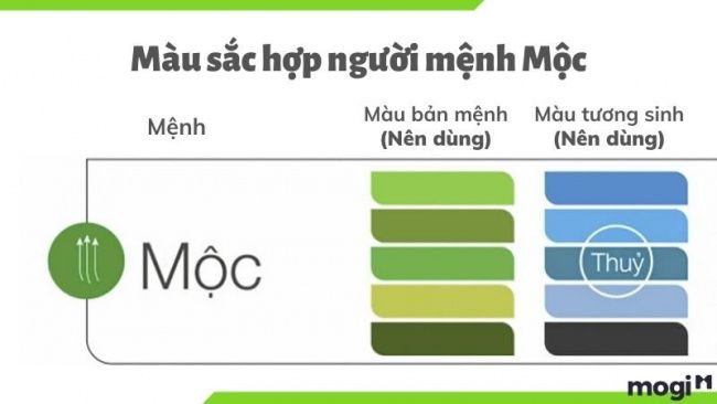 Theo nguyên tắc của ngũ hành, Mộc tương sinh Thủy nên người mang mệnh Mộc sẽ hài hòa với các tông màu xanh da trời, xanh dương, xanh nõn chuối, xanh lá cây và màu đen. Dựa trên bảng màu phong thủy kết hợp với mối quan hệ tương sinh, ta thấy rằng mệnh Mộc sẽ phù hợp nhất với các gam màu đậm đà hoặc những màu tối.