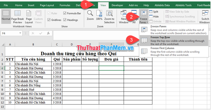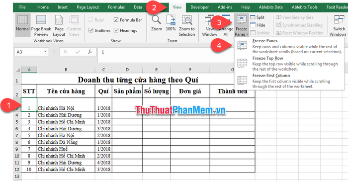 Đặt chuột tại ô đầu tiên của dòng dưới các dòng muốn giữ chặt. Ví dụ, để giữ chặt dòng 1 và dòng 2, chọn ô A3 (1). Trong thẻ Xem (2), chọn Đóng băng cửa sổ (3) => chọn Đóng băng cửa sổ (4).